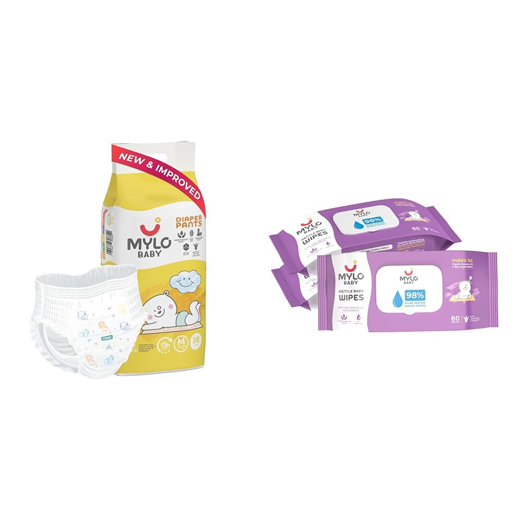 Mylo Baby Diaper Pants Medium (M) Size (38 count) Leak Proof & Mylo Baby Gentle Wipes With Lid (Pack of 3) | 80 Wipes per Pack | 7-12 kgs with Aloe Vera Lotion | Rash Free | 98% Pure Water