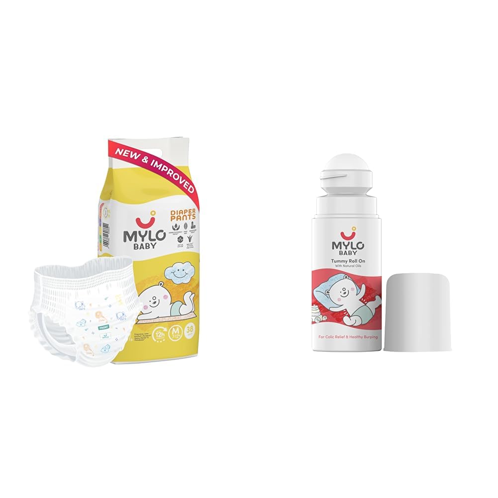 Mylo Baby Diaper Pants Medium (M) Size (38 count) Leak Proof & Mylo Baby Tummy Roll On (40ml) | 7-12 kgs | 12 Hours Protection | Made Safe Certified | Relieves Gas & Colic | Reduces Acid Reflux