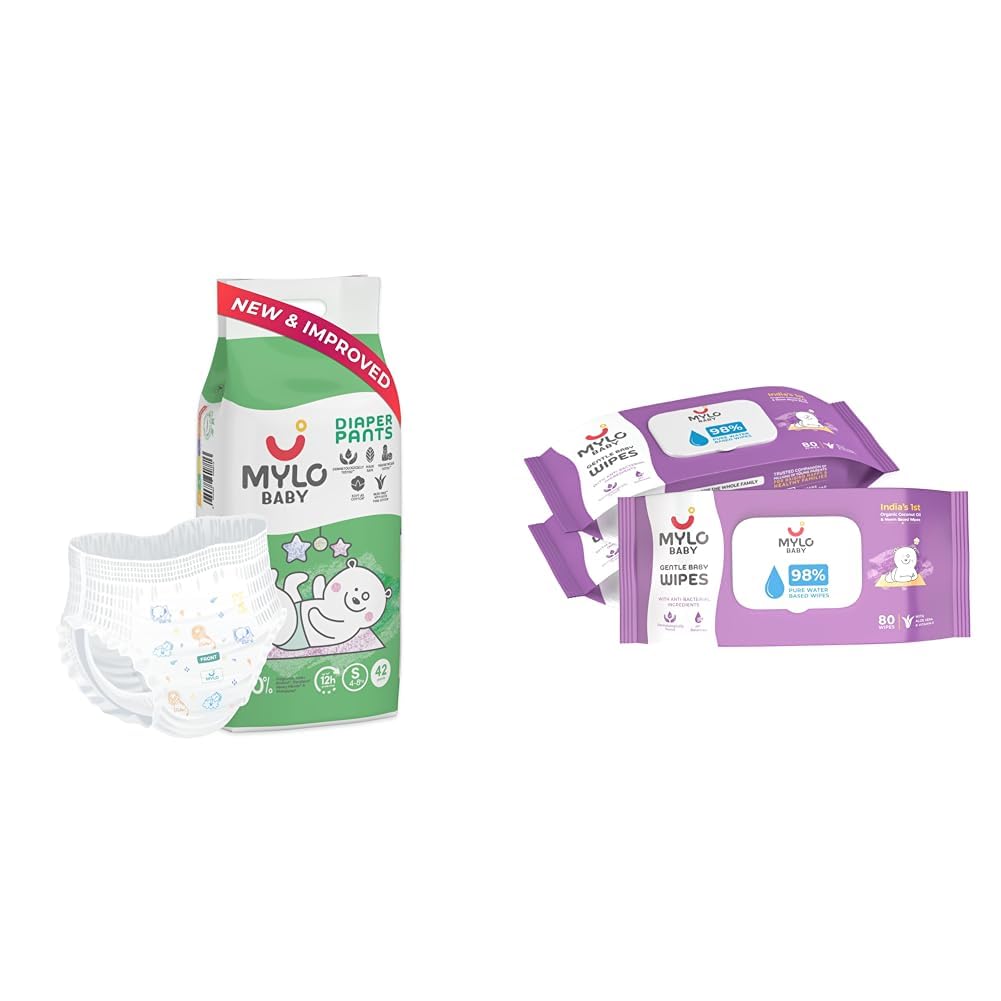 HomeBabyDiaperingBaby WipesMylo Baby Diaper Pants Small (S) (42 count) Leak Proof & Mylo Baby Gentle Wipes With Lid (Pack of 3) | 80 Wipes Count | 4-8 kgs with Aloe Vera Lotion | Rash Free | 12 Hours Protection | 98% Pure Water