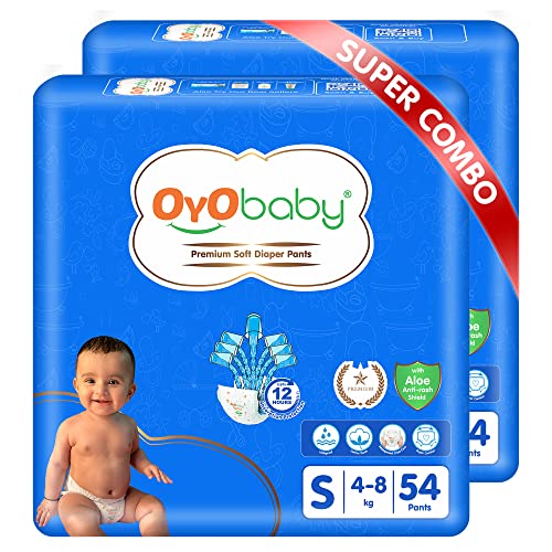 HomeBabyDiaperingBaby DiapersOYO BABY Pant Style Baby Diapers, Pack of 2 - Small (S), 54Count, for Babies 4-8kg, with Aloe Vera Lotion for Rash Protection & Up to 12 Hours Protection