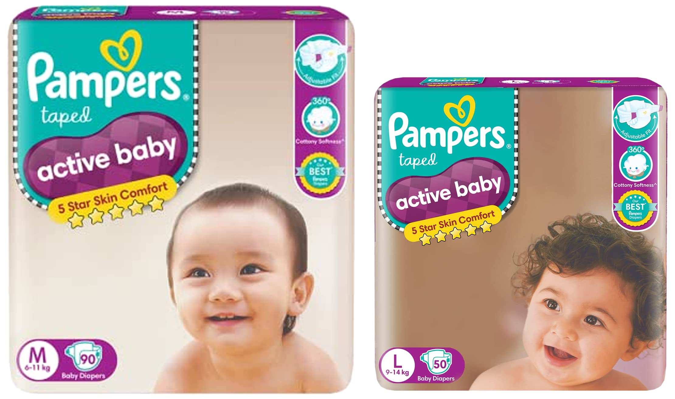 Pampers Active Baby Taped Diapers Medium size diapers (MD) 90 count Taped style custom fitOuter layer of cotton like softness this baby diaper provides intense care to your baby's sensitive skin and protects it effectively from friction rash and redness. These soft and comfort fitting diapers with stretchable sides are best for your baby's rest and playtime. The diaper's fastening tape sticks multiple times thus ensuring it stays in place even after you fasten it after checking your baby's diaper. Protection and nourishment of your baby's skin are taken care of with extracts of moisturising aloe vera lotion characteristic of these best baby diapers. These diapers are ultra thin thanks to the absorbent gel material AGM commonly known as magic gel. This magic gel core of Pampers diapers is highly effective in absorbing frequent wetness. Naturally your baby's skin remains dry for upto 12 hours now no more frequent diaper changing or blow leaks for your little angel.Pampers Active Baby Taped Diapers Large size diapers (LG) 50 count Taped style custom fit5 Star Skin Protection: The Best tape style diapers from Pampers with an outer layer of cotton-like softness this baby diaper provides intense care to your baby's sensitive skin and protects it effectively from friction rash and redness. These soft and comfort fitting diapers with stretchable sides are best for your baby's rest and playtime. The diaper's fastening tape sticks multiple times thus ensuring it stays in place even after you fasten it after checking your baby's diaper. Protection and nourishment of your baby's skin are taken care of with extracts of moisturising Aloe Vera lotion characteristic of these best baby diapers. These diapers are ultra-thin thanks to the absorbent gel material (AGM) commonly known as Magic Gel. This magic gel core of Pampers diapers is highly effective in absorbing frequent wetness. Naturally your baby's skin remains dry for upto12 hours now no more frequent diaper changing or blow leaks for your little angel. Maximum Shelf Life: 36 Months Keep your baby's skin delicate with 5 star skin protection. Pampers Active Baby comes with 5 features in just one diaper. 12 hours dryness baby lotion cottony softness breathable cover and comfortable fit. 12 Hours Dryness Our driest diaper keeps baby's skin touchably dry for up to 12 hours. Baby Lotion This unique diaper is infused with baby lotion to help prevent diaper rash. Cottony Softness Keep baby's skin free from irritation with cotton-like softness. Breathable Cover Air circulates so baby's skin can breathe easily and stay wonderfully fresh. Comfortable Fit A flexible side stretch design keeps it snug and comfy whether baby is at rest or play. Diaper Sizer Five Features in One Diaper View Larger Comparison Chart View Larger Using Pampers Pants When to Change Right before or right after every feeding After every bowel movement Before bedtime When your baby wakes up When you go out with your baby How to Change Put the diaper under the baby's body. Pull the elastic side properly. Apply both sides in symmetrical position on landing zone. Adjust the cuff around legs on both sides.
