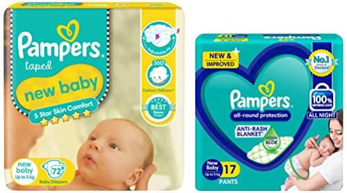 Pampers Active Baby Diapers, New Born, Extra Small, (NB, XS) size, 72 Count & Pampers All round Protection Pants, New Born, Extra Small size baby diapers (NB/XS), 17 Count