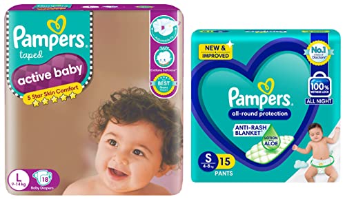 Pampers Active Baby Taped Diapers, Large size diapers, (L) 18 count, taped style custom fit & Pampers All round Protection Pants, Small size baby Diapers, (S) 15 Count Lotion with Aloe Vera