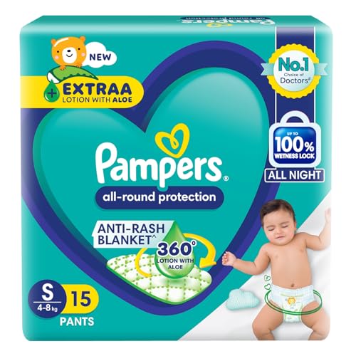 Pampers All Round Protection Pant Style Baby Diapers, Small (S), 15 Count, Anti Rash Blanket, Lotion with Aloe Vera, 4-8 Kg Diapers