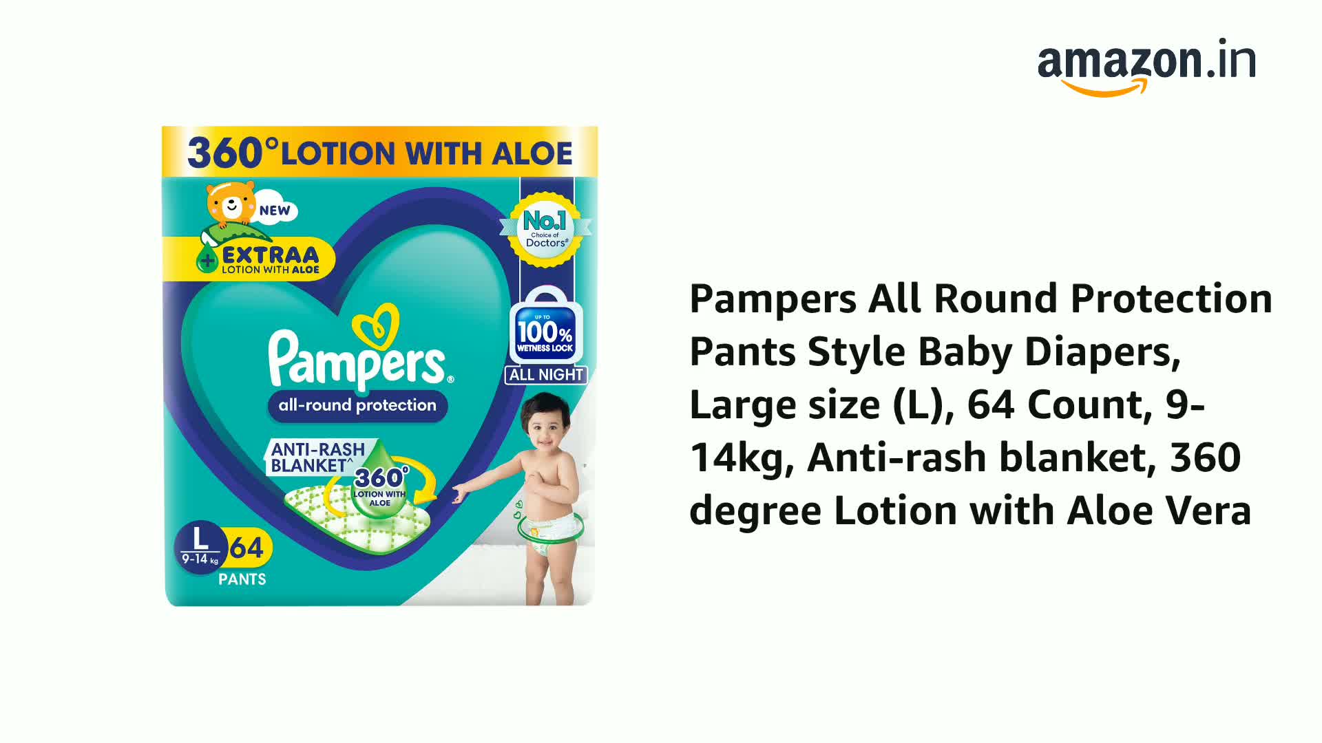 Pampers All Round Protection Pant Style Baby Diapers are available in New born (NB) Small (S) Medium (M) Large (L) X-Large (XL) XX-Large (XXL) XXX-Large (XXXL) sizes. NEW and IMPROVED Pampers all round protection pants have ANTI RASH BLANKET* containing Lotion with Aloe Vera to keep your baby skin protected from redness and rashes. Top quality diaper pants with Up to 100% WETNESS LOCK keeps the pee locked inside and baby's bum stays dry for ALL NIGHT. Air channels & stretchy belt provides your baby breathable airy fit comfortable even in summers. Pampers unique Magic gel technology provides up to 12 hours of dryness and has up to 2X faster absorption The new and improved design has an EXTRA SOFT material and a fit that adapts to baby movements for best comfort. Our pants with fun exterior graphics fun designs of characters and a delightful fresh Aloe fragrance ensures you enjoy every change with your baby (*Blanket refers to soft topsheet with lotion Helps prevent rash due to wetness after 1 day of usage based on clinical studies in USA 2000 2019)