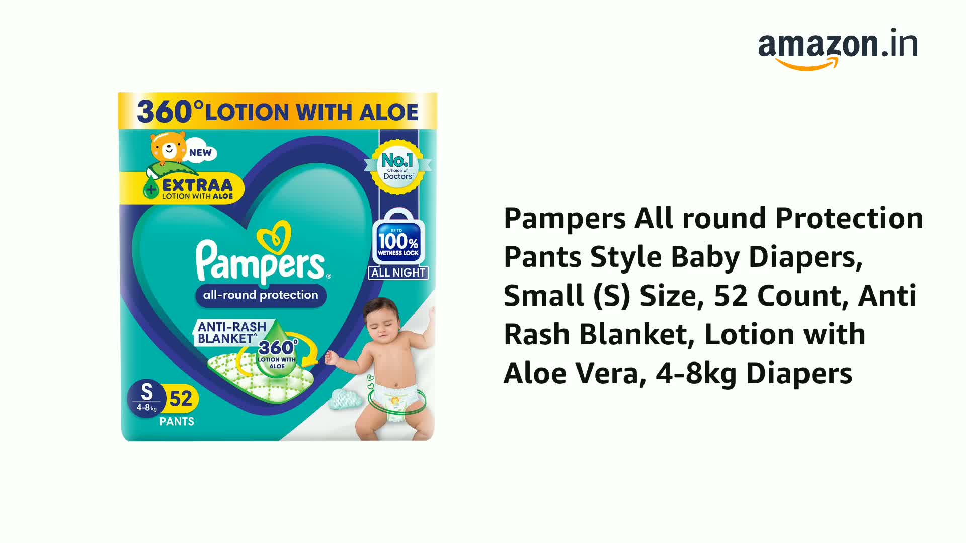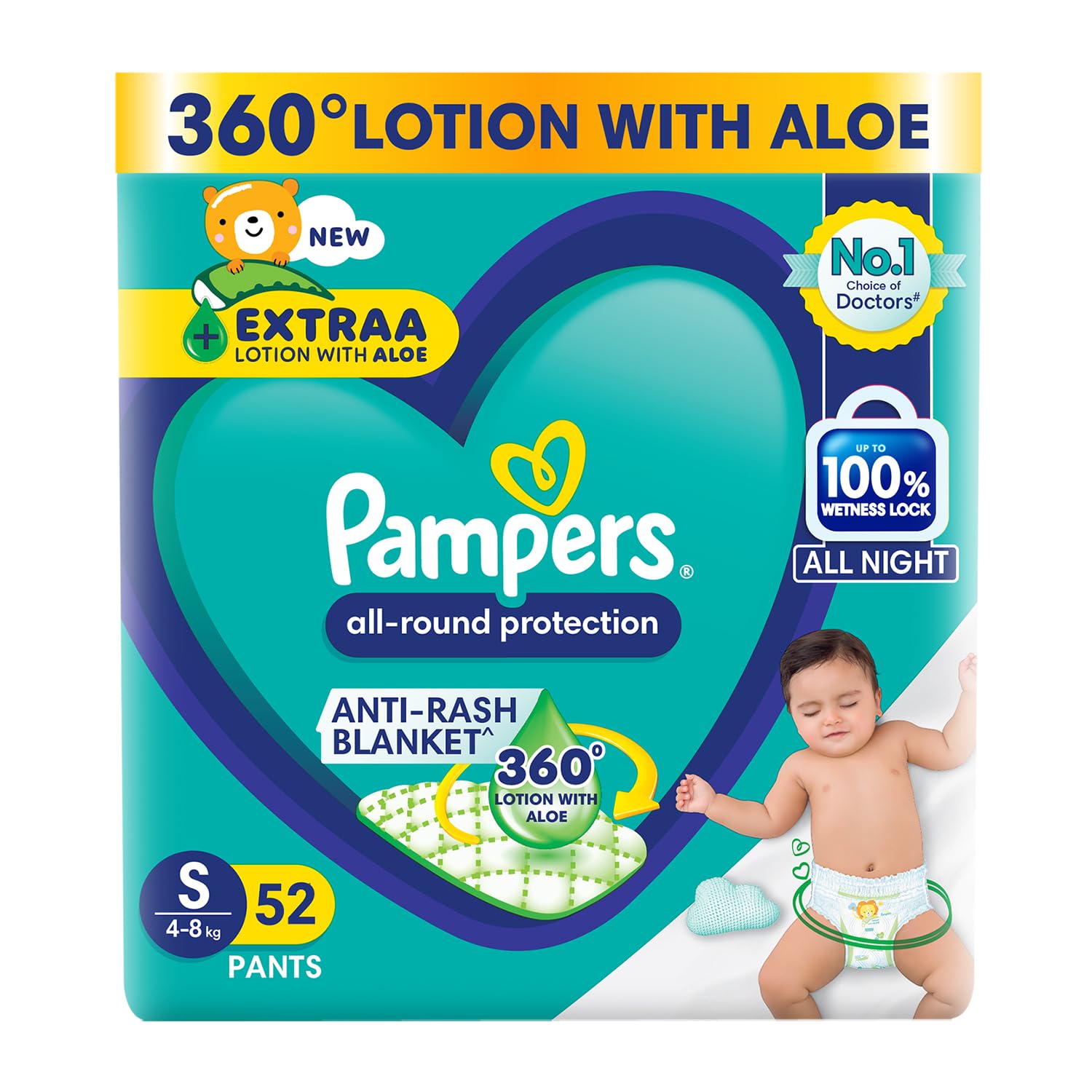 Pampers All Round Protection Pant Style Baby Diapers are available in New born (NB) Small (S) Medium (M) Large (L) X-Large (XL) XX-Large (XXL) XXX-Large (XXXL) sizes. NEW and IMPROVED Pampers all round protection pants have ANTI RASH BLANKET* containing Lotion with Aloe Vera to keep your baby skin protected from redness and rashes. Top quality diaper pants with Up to 100% WETNESS LOCK keeps the pee locked inside and baby's bum stays dry for ALL NIGHT. Air channels & stretchy belt provides your baby breathable airy fit comfortable even in summers. Pampers unique Magic gel technology provides up to 12 hours of dryness and has up to 2X faster absorption. The new and improved design has an EXTRA SOFT material and a fit that adapts to baby movements for best comfort. Our pants with fun exterior graphics fun designs of characters and a delightful fresh Aloe fragrance ensures you enjoy every change with your baby (*Blanket refers to soft topsheet with lotion Helps prevent rash due to wetness after 1 day of usage based on clinical studies in USA 2000 2019).