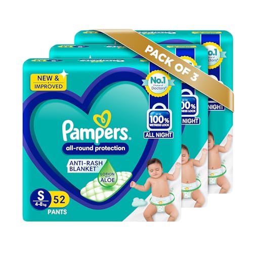 HomeBabyDiaperingBaby DiapersPampers All round Protection Pants Style Baby Diapers, Small (S) Size, 52 Count, Anti Rash Blanket, Lotion with Aloe Vera, 4-8kg Diapers (Pack of 3)