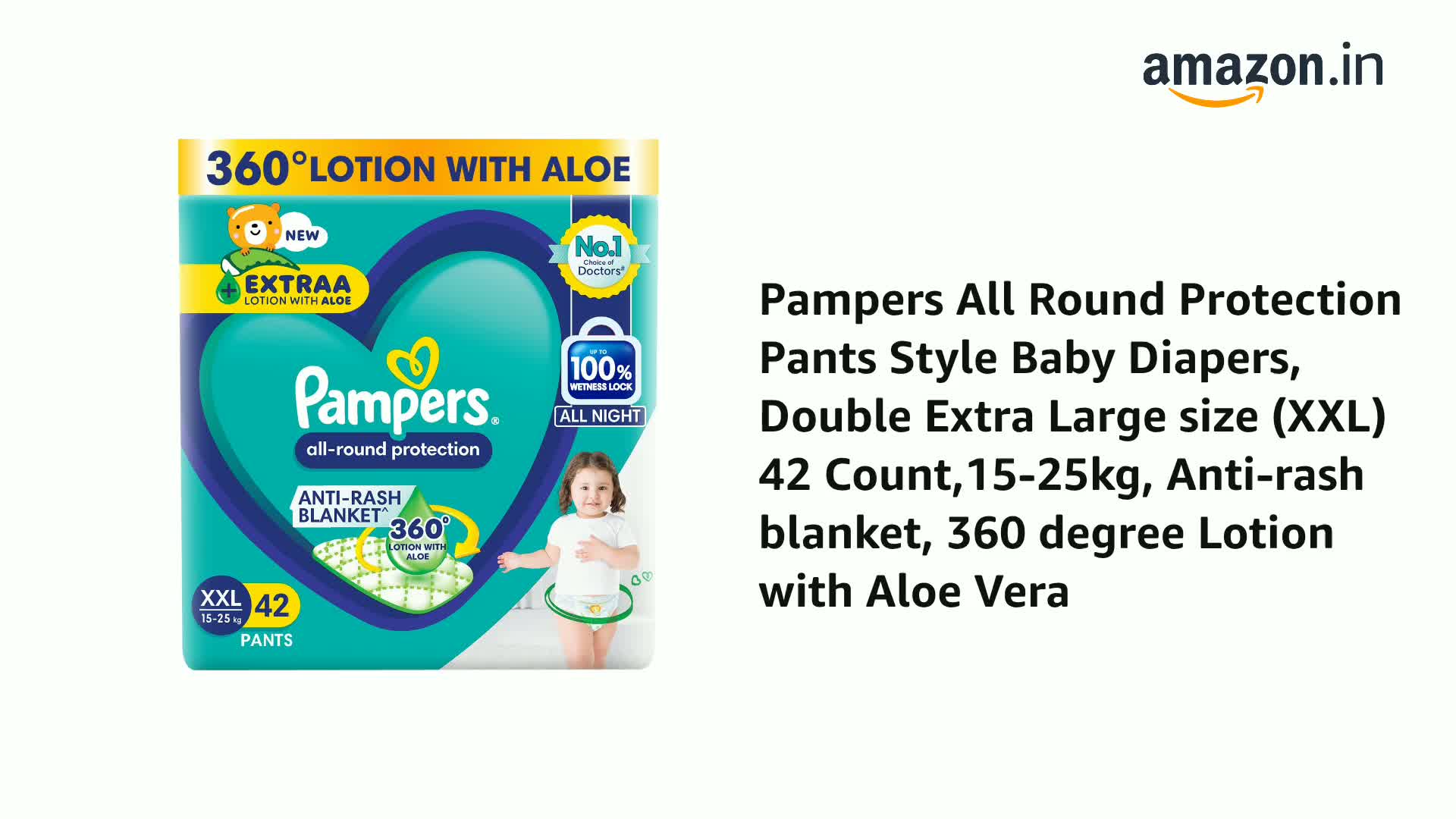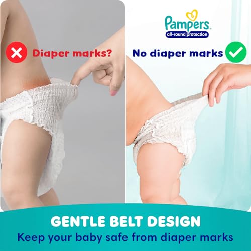 Pampers All Round Protection Pant Style Baby Diapers are available in New born (NB) Small (S) Medium (M) Large (L) X-Large (XL) XX-Large (XXL) XXX-Large (XXXL) sizes. NEW and IMPROVED Pampers all round protection pants have ANTI RASH BLANKET* containing Lotion with Aloe Vera to keep your baby skin protected from redness and rashes. Top quality diaper pants with Up to 100% WETNESS LOCK keeps the pee locked inside and baby's bum stays dry for ALL NIGHT. Air channels & stretchy belt provides your baby breathable airy fit comfortable even in summers. Pampers unique Magic gel technology provides up to 12 hours of dryness and has up to 2X faster absorption The new and improved design has an EXTRA SOFT material and a fit that adapts to baby movements for best comfort. Our pants with fun exterior graphics fun designs of characters and a delightful fresh Aloe fragrance ensures you enjoy every change with your baby (*Blanket refers to soft topsheet with lotion Helps prevent rash due to wetness after 1 day of usage based on clinical studies in USA 2000 2019)
