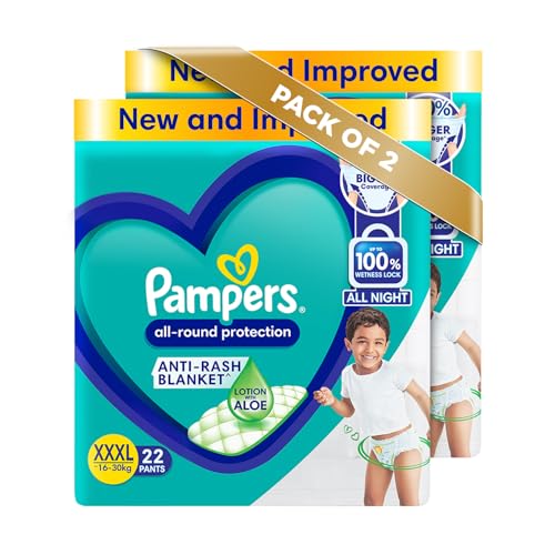 Pampers All round Protection Pants Style Baby Diapers, XXX-Large (XXXL) Size, 22 Count, Anti Rash Blanket, Lotion with Aloe Vera, 17+ kgs Diapers (Pack of 2)