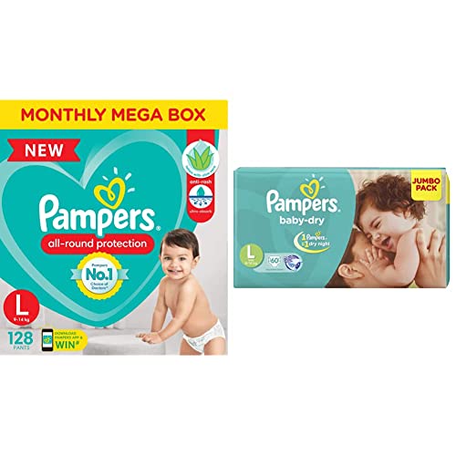 Pampers Baby Dry Pants Diapers Monthly Mega Box Large 128 CountPampers Baby-Dry pants style diapers are the only pants in India with Ultra Absorb Core Double Leak Guards and Lotion with Aloe Vera. Ultra Absorb Core provides your baby a new type of dryness overnight - breathable dryness. Magic gel locks wetness away to provide up to 12 hours of dryness. Now infused with baby lotion that has Aloe Vera helps protect your baby’s delicate skin from diaper rash and irritation. The new and improved product design enables a comfortable fit closer to the baby’s body and a flexible waist band that adapts to baby’s movements for a comfortable fit. A top layer with cotton-like soft material ensure a comfortable night’s sleep. Our pants with fun exterior graphics fun designs and characters ensure you enjoy with your baby.Pampers Baby Dry Diaper Pants Large (60 Count)Let your baby's skin breathe easy with the airy soft comfort offered by the Pampers diapers. These tape style Pamper diapers are easy to put on your baby and change which comes as a great help to mothers. These comfort fitting diapers with stretchable sides are best for your baby's rest and playtime Offering complete care and protection these baby diaper will help keep your baby smiling and comfortable at all times.. With Magic gel layer these baby diaper offers overnight dryness and protects your baby's delicate skin from rash.