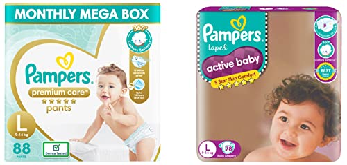 Pampers Premium Care Pants Large size baby Diapers (L) 88 Count Softest ever Pampers PantsNew Pampers Premium Care Pants with 360 degree cottony softness gives your baby the ultimate comfort all day all night long. Pampers Premium Care Pants contain soothing lotion with Aloe Vera to protect your baby’s skin from rashes while its 10 million micropores allow your baby’s skin to breathe. Its 12-hour leak lock facility keeps your baby dry and away from wetness. Experience 5-Star comfort with unique added features like Wetness Indicator which turns Yellow to Blue indicating when you may change the diaper and a Disposal Tape to help you with easy disposal. Pampers Premium Pants are available in New-born (NB) S M L XL and XXL sizes.Pampers Active Baby Taped Diapers Large size diapers (LG) 78 count taped style custom fit5 Star Skin Protection: The Best tape style diapers from Pampers with an outer layer of cotton-like softness this baby diaper provides intense care to your baby's sensitive skin and protects it effectively from friction rash and redness. These soft and comfort fitting diapers with stretchable sides are best for your baby's rest and playtime. The diaper's fastening tape sticks multiple times thus ensuring it stays in place even after you fasten it after checking your baby's diaper. Protection and nourishment of your baby's skin are taken care of with extracts of moisturizing Aloe Vera lotion characteristic of these best baby diapers.. These diapers are ultra-thin thanks to the absorbent gel material (AGM) commonly known as Magic Gel. This magic gel core of Pampers diapers is highly effective in absorbing frequent wetness. Naturally your baby's skin remains dry for upto 12 hours now no more frequent diaper changing or blow leaks for your little angel.