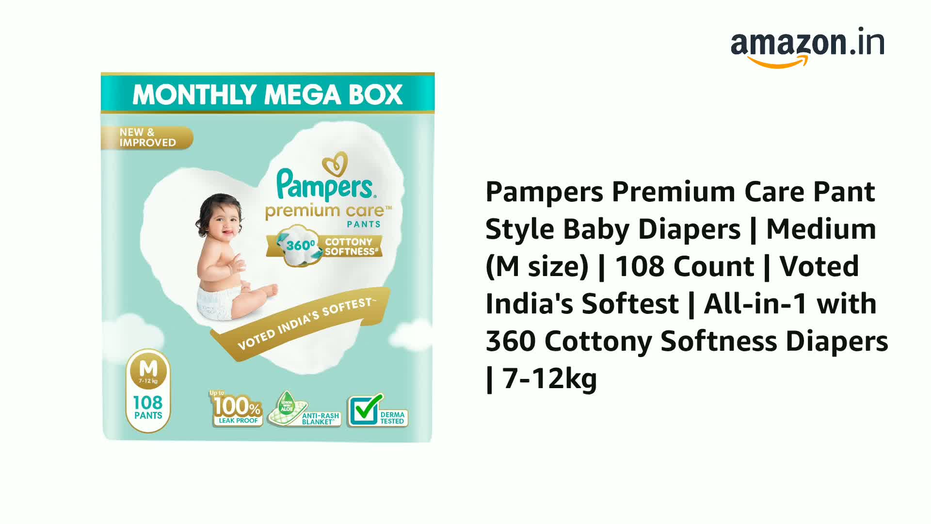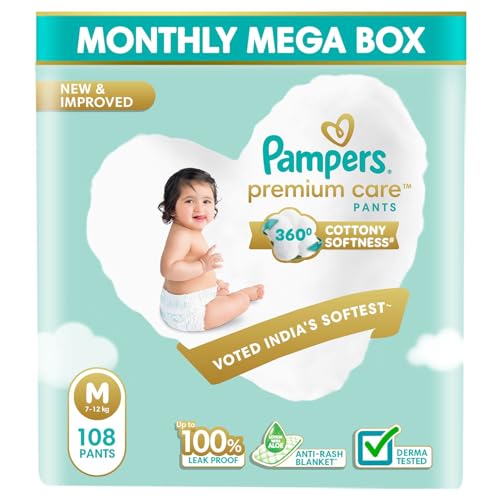 Pampers Premium Care Pant Style Baby Diapers | Medium (M size) | 108 Count | Voted India's Softest | All-in-1 with 360 Cottony Softness Diapers | 7-12kg