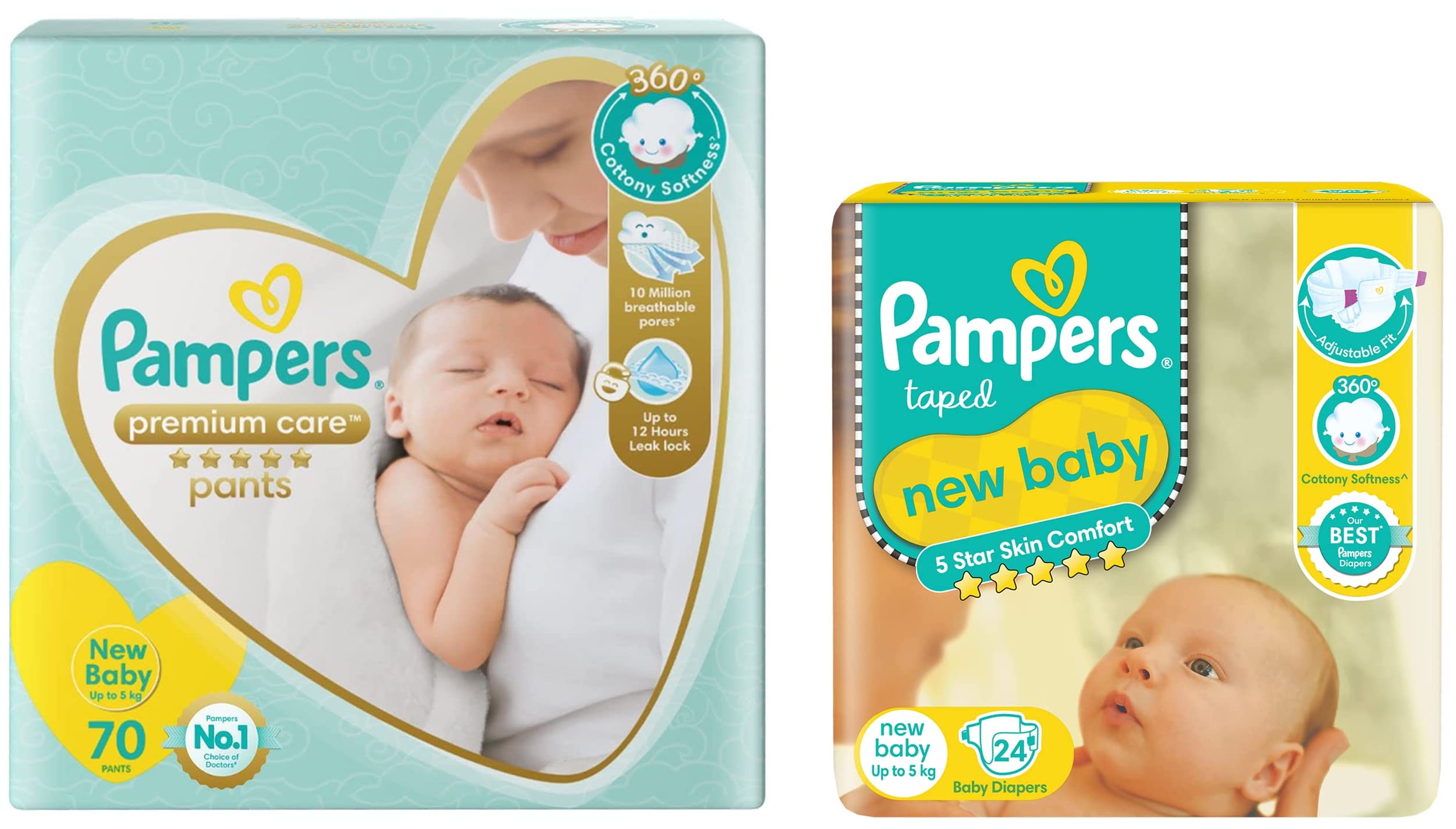 Pampers Premium Care Pants New Born Extra Small size baby Diapers (NB/XS) 70 count Softest ever PampersNew Pampers Premium Care Pants with 360 degree cottony softness gives your baby the ultimate comfort all day all night long. Pampers Premium Care Pants contain soothing lotion with Aloe Vera to protect your baby skin from rashes while its 10 million micropores allow your baby skin to breathe. Its 12-hour leak lock facility keeps your baby dry and away from wetness. Experience 5-Star comfort with unique added features like Wetness Indicator which turns Yellow to Blue indicating when you may change the diaper and a Disposal Tape to help you with easy disposal. Pampers Premium Pants are available in New-born (NB) S M L XL and XXL sizes.Pampers Active Baby Diapers New Born Extra Small (NB XS) size 24 Count Taped style diaper5 Star Skin Protection: The Best tape style diapers from Pampers with an outer layer of cotton-like softness this baby diaper provides intense care to your baby's sensitive skin and protects it effectively from friction rash and redness. These soft and comfort fitting diapers with stretchable sides are best for your baby's rest and playtime. The diaper's fastening tape sticks multiple times thus ensuring it stays in place even after you fasten it after checking your baby's diaper. Protection and nourishment of your baby's skin are taken care of with extracts of moisturizing Aloe Vera lotion characteristic of these best baby diapers.. These diapers are ultra-thin thanks to the absorbent gel material (AGM) commonly known as Magic Gel. This magic gel core of Pampers diapers is highly effective in absorbing frequent wetness. Naturally your baby's skin remains dry for upto 12 hours now no more frequent diaper changing or blow leaks for your little angel.