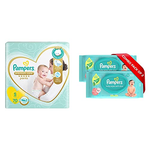 Pampers Premium Care Pants New Born Extra Small size baby Diapers (NB/XS) 70 count Softest ever PampersNew Pampers Premium Care Pants with 360 degree cottony softness gives your baby the ultimate comfort all day all night long. Pampers Premium Care Pants contain soothing lotion with Aloe Vera to protect your baby skin from rashes while its 10 million micropores allow your baby skin to breathe. Its 12-hour leak lock facility keeps your baby dry and away from wetness. Experience 5-Star comfort with unique added features like Wetness Indicator which turns Yellow to Blue indicating when you may change the diaper and a Disposal Tape to help you with easy disposal. Pampers Premium Pants are available in New-born (NB) S M L XL and XXL sizes.Pampers Active Baby Taped Diapers Large size diapers (L) 18 count taped style custom fit5 Star Skin Protection: The Best tape style diapers from Pampers with an outer layer of cotton-like softness this baby diaper provides intense care to your baby's sensitive skin and protects it effectively from friction rash and redness. These soft and comfort fitting diapers with stretchable sides are best for your baby's rest and playtime. The diaper's fastening tape sticks multiple times thus ensuring it stays in place even after you fasten it after checking your baby's diaper. Protection and nourishment of your baby's skin are taken care of with extracts of moisturizing Aloe Vera lotion characteristic of these best baby diapers.. These diapers are ultra-thin thanks to the absorbent gel material (AGM) commonly known as Magic Gel. This magic gel core of Pampers diapers is highly effective in absorbing frequent wetness. Naturally your baby's skin remains dry for upto12 hours now no more frequent diaper changing or blow leaks for your little angel.