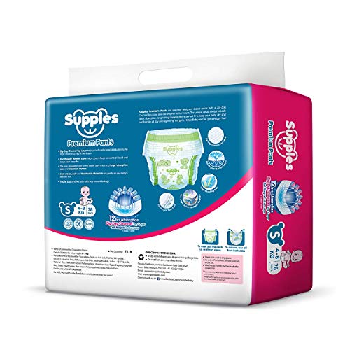 Supples Baby Wet Wipes with Aloe Vera and Vitamin E - 72 Wipes/Pack (Pack of 9)Infused with the goodness of Aloe Vera and Vitamin-E the Supples baby wipes are a handy way to keep your baby's delicate skin refreshed and clean. The Supples baby wipes are 100 percent free from alcohol parabens soap chlorine and other toxic elements and thus entirely safe for everyday use. Take it anywhere you go with your baby and protect your little one from skin infections.Supples Baby Pants Diapers Small (4 - 8 kg) 78 CountThese diaper pants keep your baby comfortable in the day as well as in night. Their cottony soft material is gentle on your baby skin keeping their precious skin perfect.