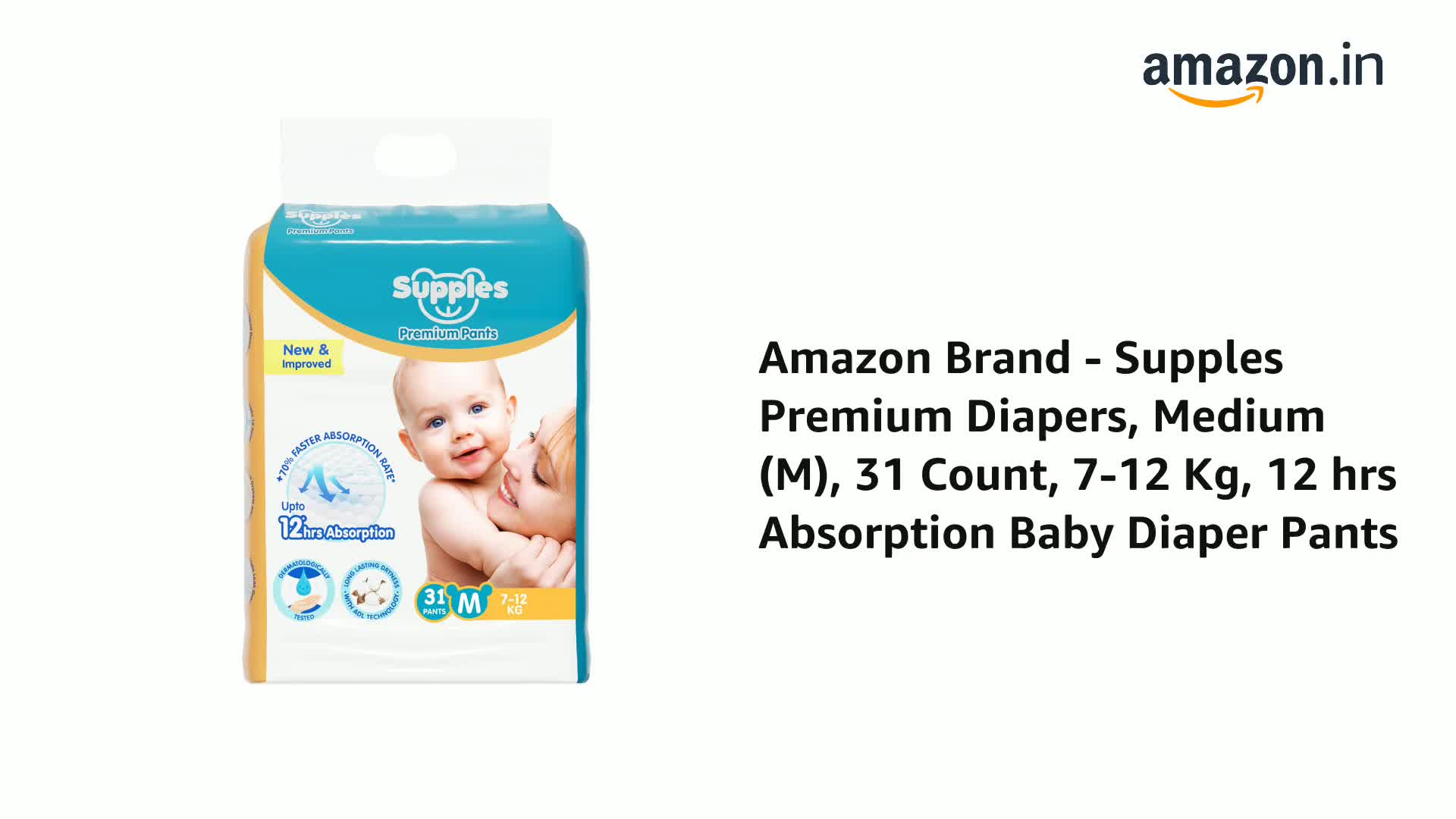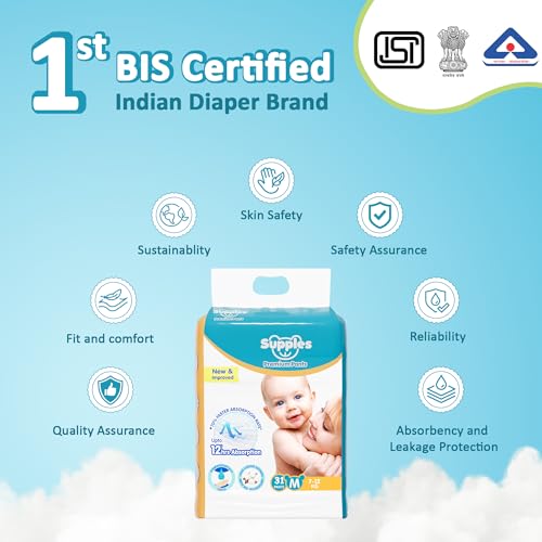 Amazon Brand - Supples Premium Baby Diaper Pants | 31 Baby Diapers | Medium | 7-12 Kg | 12 Hrs Absorption | Cushiony Cotton Soft Fabric | Phthalates-Free | Triple Leak Guard