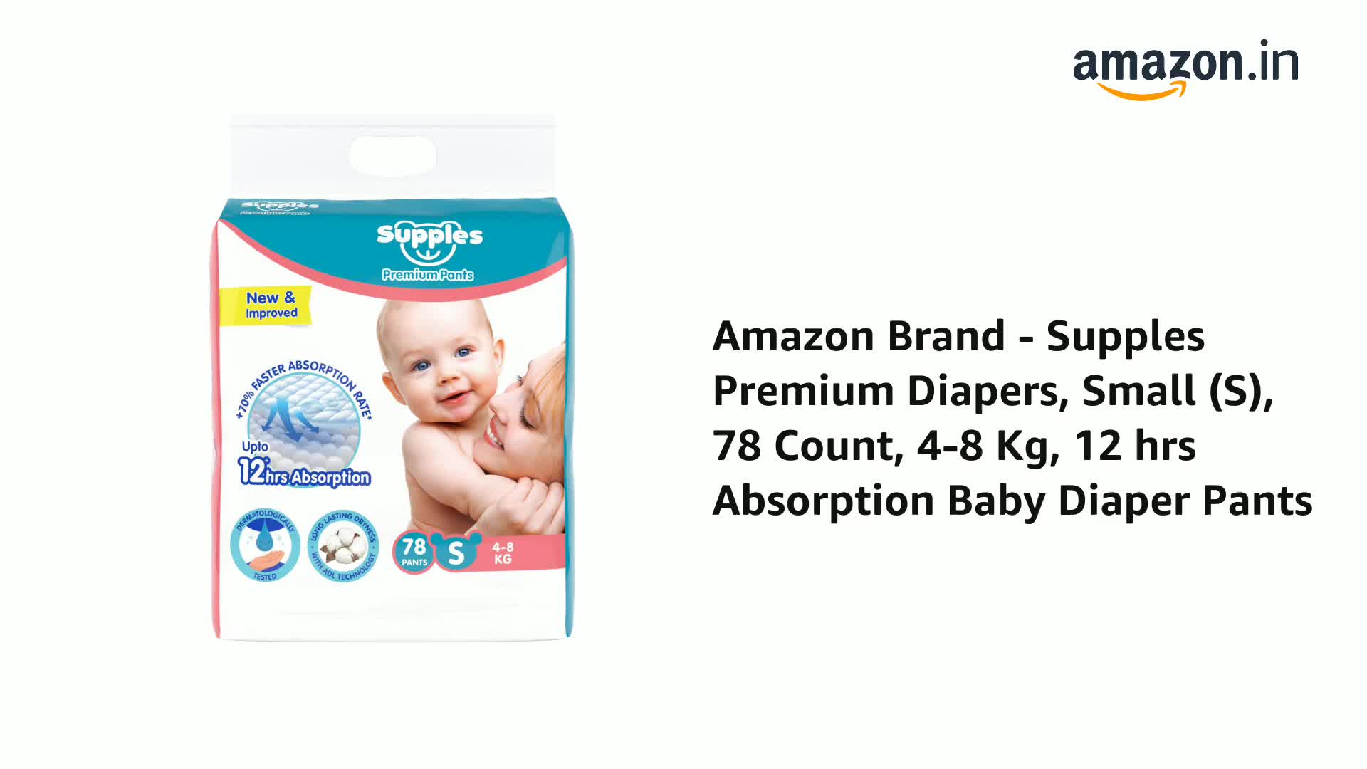 Amazon Brand - Supples Premium Baby Diaper Pants | 78 Baby Diapers | Small | 4-8 Kg | 12 Hrs Absorption | Cushiony Cotton Soft Fabric | Phthalates-Free | Triple Leak Guard