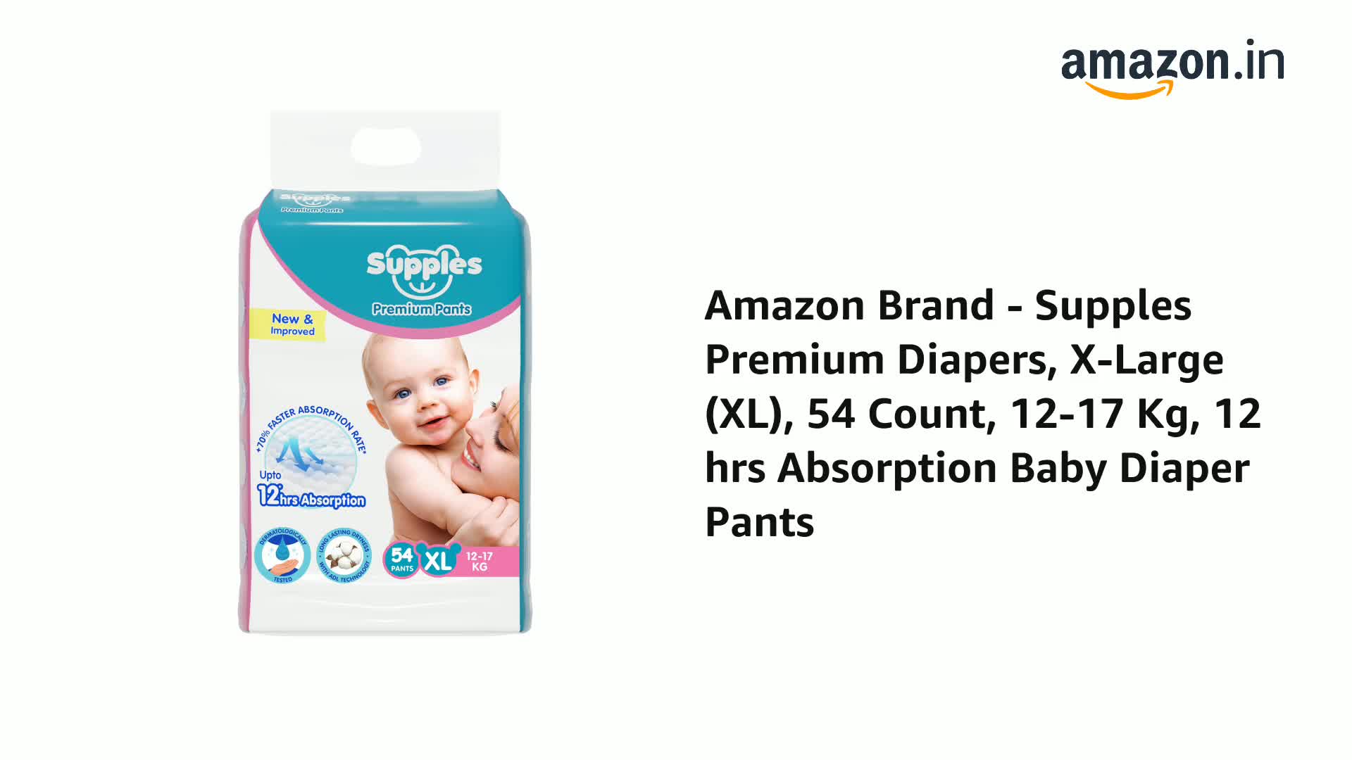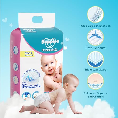 SUPPLES PREMIUM DIAPER PANTS: Choosing the diaper for your baby is an important step in ensuring your little one comfort during the day as well as overnight. We understand that nothing is more important than the comfort of your little baby. With Supples Premium diaper pants we want to keep your baby comfortable both in day as well as in night thus delivering happiness to every doorstep. Choosing the right diaper size based on baby weight is important. The diaper capacity may vary among babies depending on the volume of pee and posture. Available in sizes NB S M L XL XXL