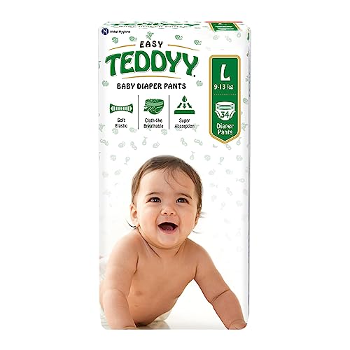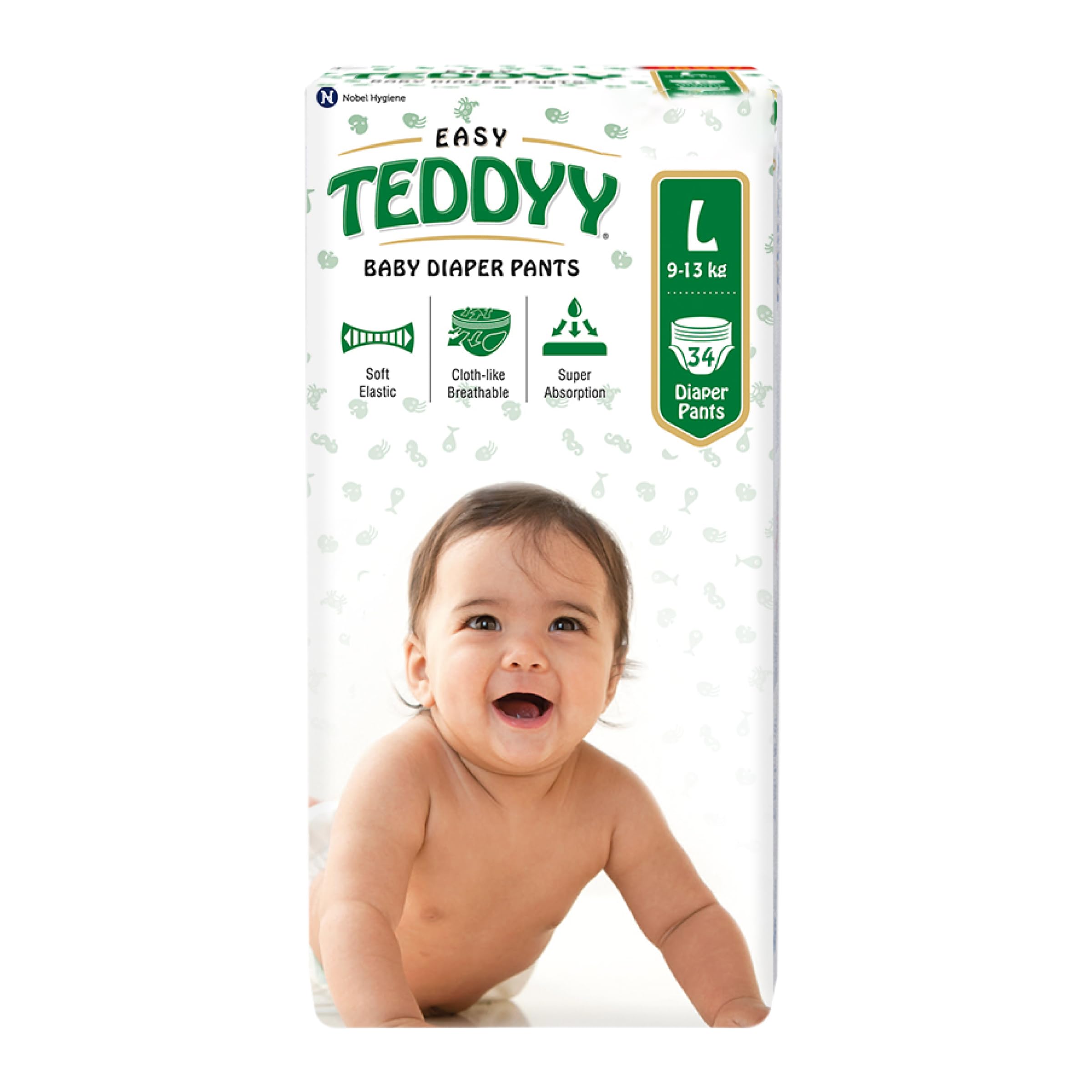 TEDDYY Baby Diapers Pants Easy Large 34s Pack, 9-14 kgs, 12 hrs Leak Protection, Anti - Bacterial