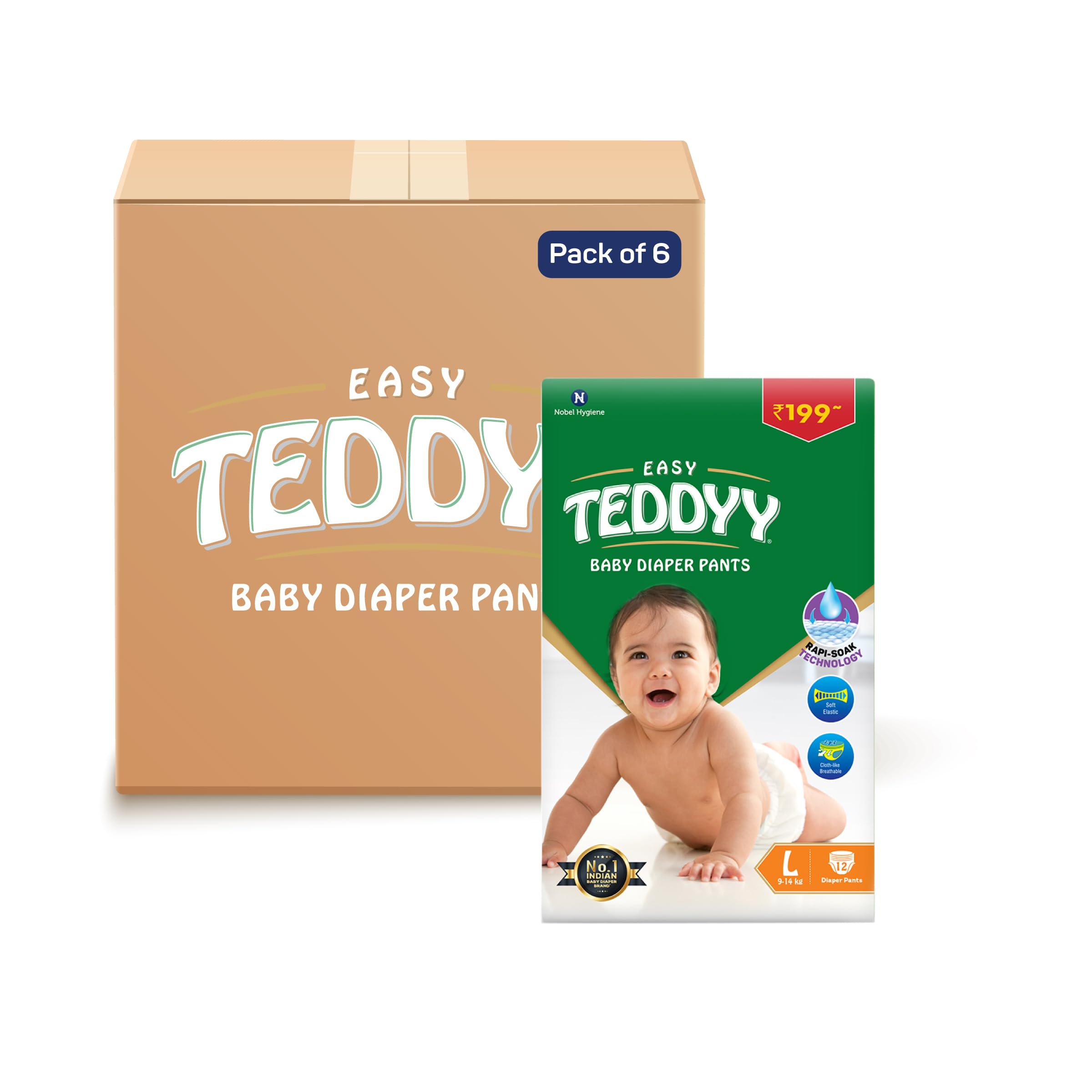 TEDDYY Baby Diapers Pants Easy Large 72 Count (Pack of 6) 9-14 kgs 12 hrs Leak Protection Anti - Bacterial