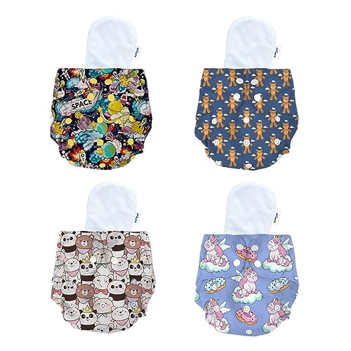 Bumtum Baby Diaper | 0-3 Yrs Baby Freesize | Pack of 4, New Born Baby Diaper, Cloth Diaper, Waterproof Reusable Diaper, Washable, Cotton, Extra Soft (Teddy, Unicorn, Teddy Face & Space Old)
