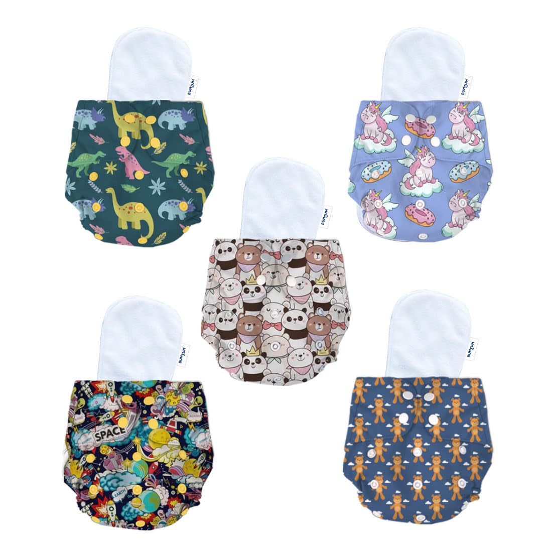 Bumtum Baby Diaper | 0-3 Yrs Baby Freesize | Pack of 5, New Born Baby Diaper, Cloth Diaper, Waterproof Reusable Diaper, Washable, Cotton, Extra Soft (Teddy, Unicorn, Teddy Face, Space Old & Dinosaur)