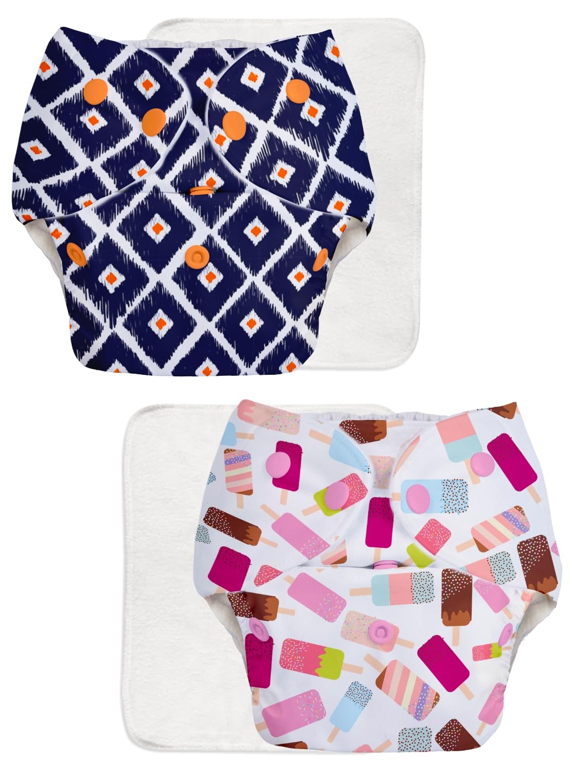 CONTENTS -2 BASIC EASY Freesize cloth diaper with 2 dry feel pad/insert .BASIC EASY comes with dry feel lined soaker which you can keep on top! No more stuffing of pockets. Cloth diaper that's easy!