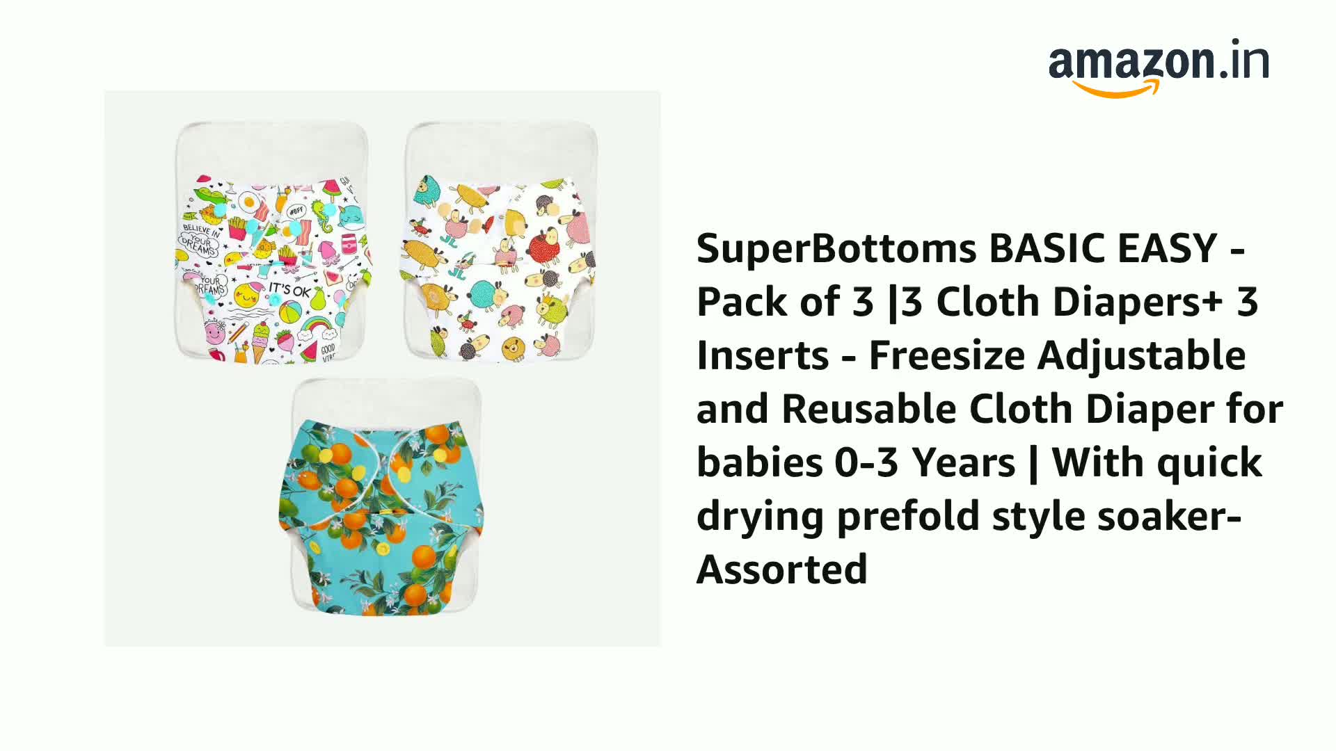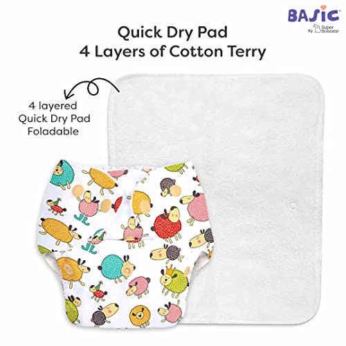 SuperBottoms BASIC EASY - Pack of 3 |3 Cloth Diapers+ 3 Inserts - Freesize Adjustable and Reusable Cloth Diaper for babies 0-3 Years | With quick drying prefold style soaker-Assorted