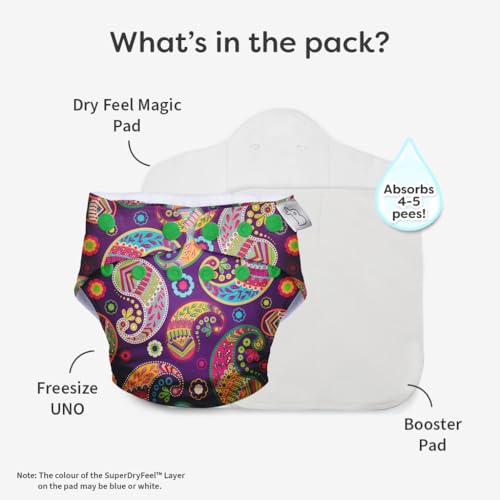 • CONTENTS: The pack contains 5 Freesize UNO Washable Cloth Diaper - New Version (5 Waterproof Outers + 5 Dry Feel Magic Pads (Cloth diaper inserts) with SuperDryFeel Layer). The adjustable cloth diaper is freesize and is ideal for babies from 7kg-17kg. Sup