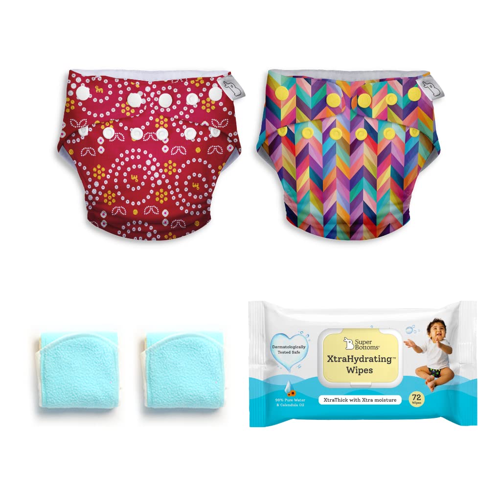 SuperBottoms Pack of 2 Cloth Diapers for babies and XtraHydrating¢ Wipes-72 Pack-Freesize Washable & Reusable waterproof Adjustable cloth diaper for babies from 5-17kgs|Diaper with 2 Dry Feel Pad