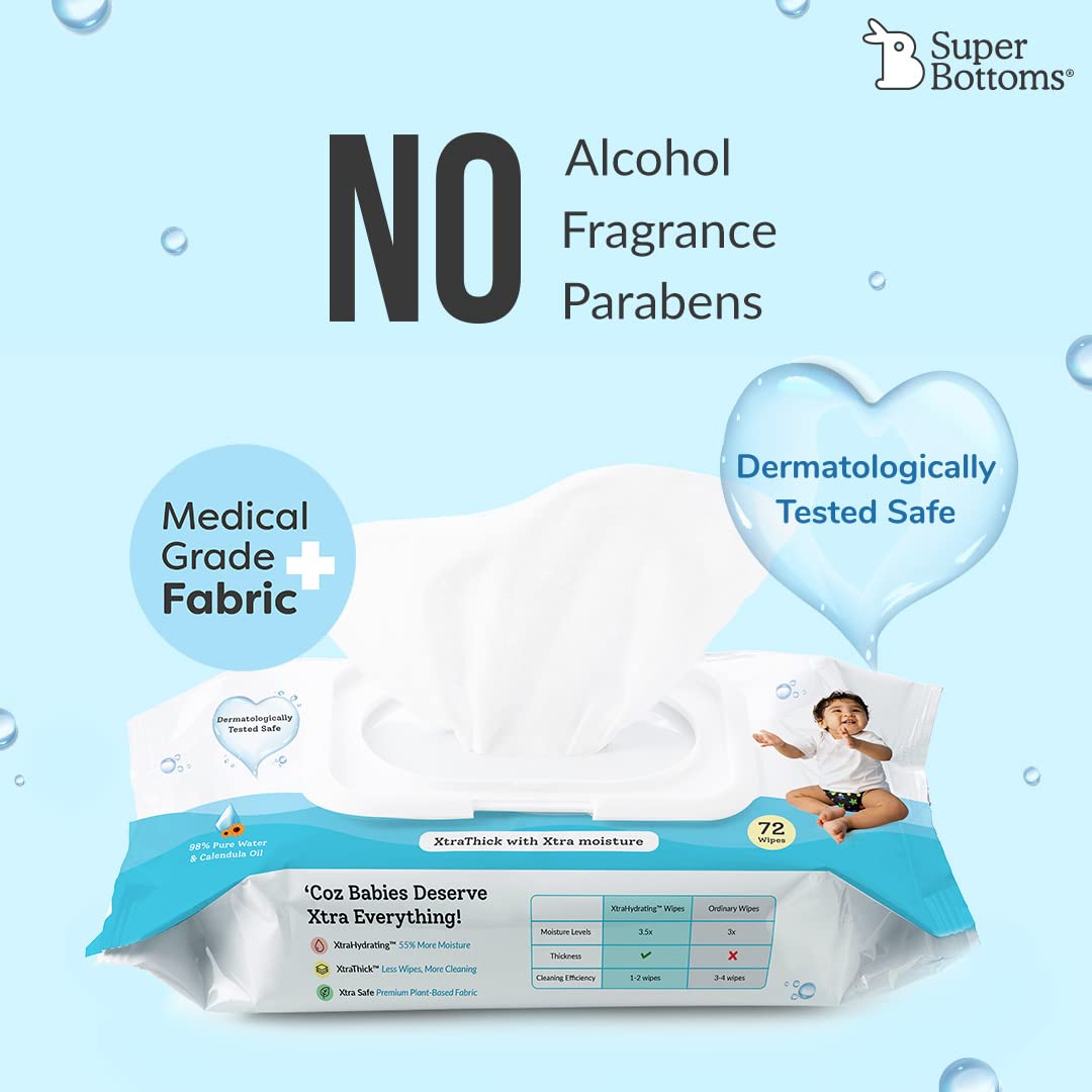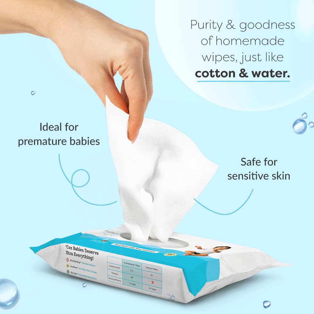 • More Moisture More Hydration- XtraHydrating Wipes has 3.5x extra moisture to hydrate & nourish the skin while cleaning. It contains 98% Pure Water & Calendula Oil extracts.Wipe Size : 20 x 15(WxL)cm