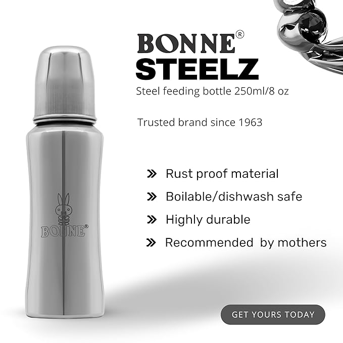 Give your baby the best with BONNE 250ml Stainless Steel Baby Feeding Bottle, designed to ensure safe, hygienic, and comfortable feeding. This plastic-free steel baby bottle is crafted from high-quality, rust-proof stainless steel milk bottle , making it a durable, non-toxic, and odour-free baby feeder for newborns, infants, and toddlers up to 3 years. Whether you're looking for a milk bottle for kids 1 year, a steel feeding bottle for 2 year baby, or a steel milk bottle for kids 2 years, this bottle is the perfect choice.