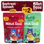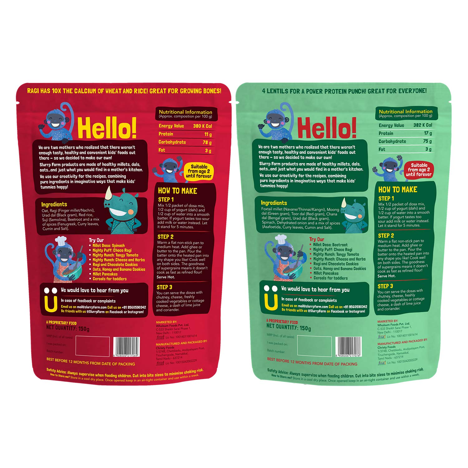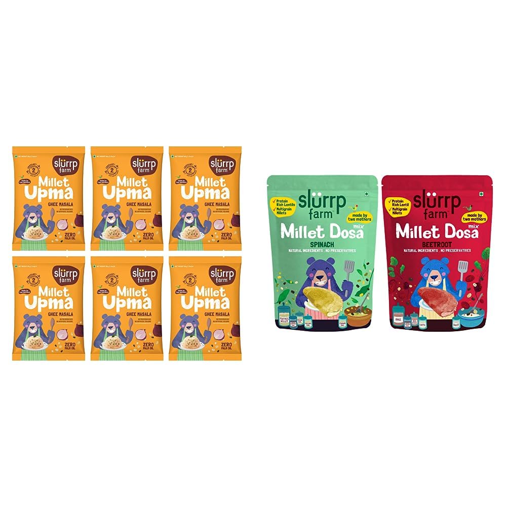 Slurrp Farm Instant Millet Rava Upma Mix- Ghee Masala - Multigrain Breakfast Mix | No Palm Oil | 50g X 6An instant breakfast meal made with a blend of millets (jowar oats bajra) chana suji and urad dal. Comes in yummy ghee & tomato masala flavours with no preservatives no artificial colours or flavours no trans fat no palm oil. Ready in 2 minutes. Slurrp Farm Millet Upma Mix is a convenient and nutritious option during morning rush or travel with family. Now everyone will be #UpForUpma \U0001f60b\U0001f60Slurrp Farm Millet Dosa Instant Mix Supergrains Spinach And Beetroot Natural And Healthy Food 150g (Pack Of 2)At slurp farm we make honest and healthy food just like you would at home. So this dosa mix has no preservatives no artificial flavours and no colours. It is filled with the goodness of five super grains are ragi red rice oat urad dal suji beetroot and mild spices. Based on traditional dosa recipes from our family kitchen made by two mothers for you and your children.