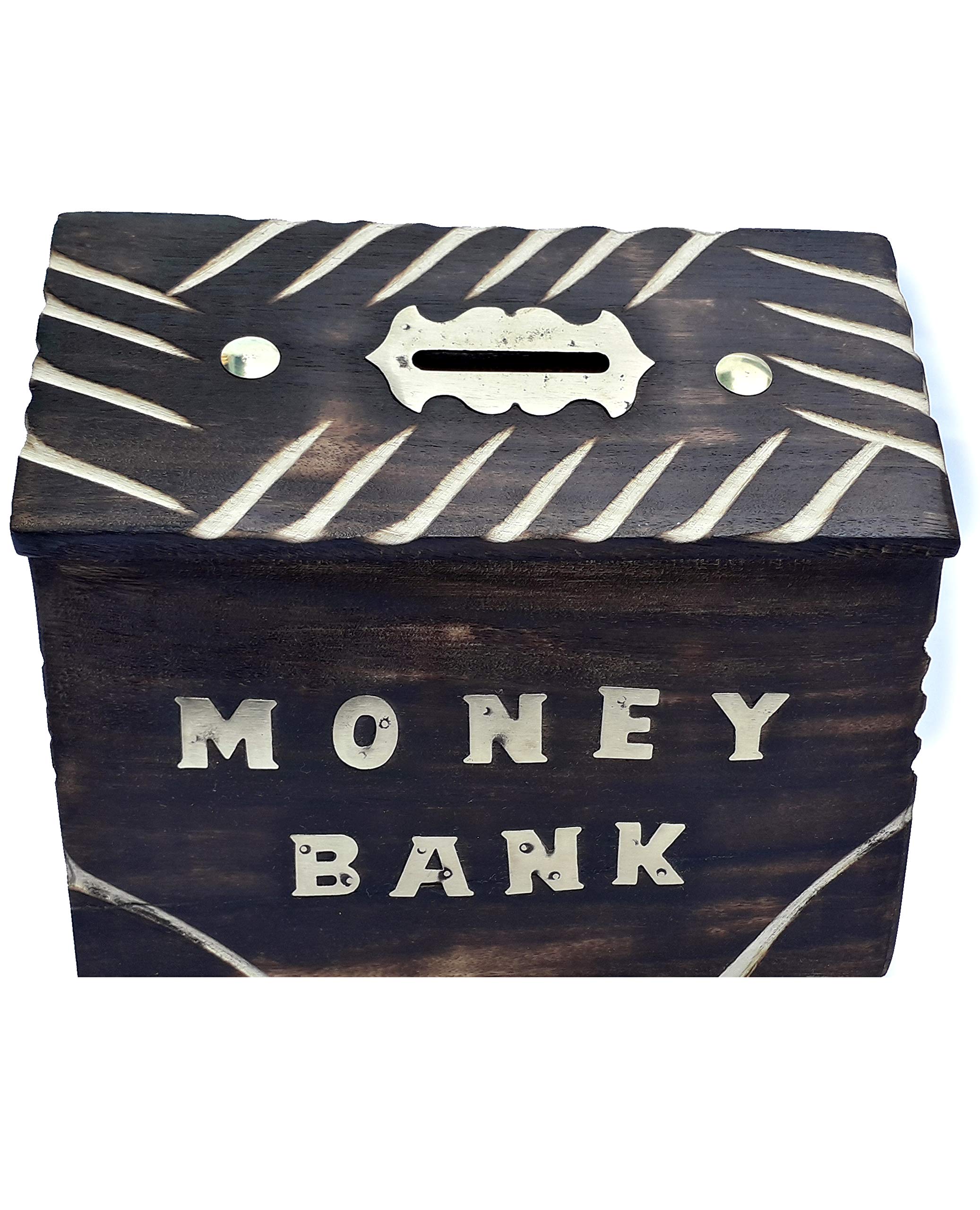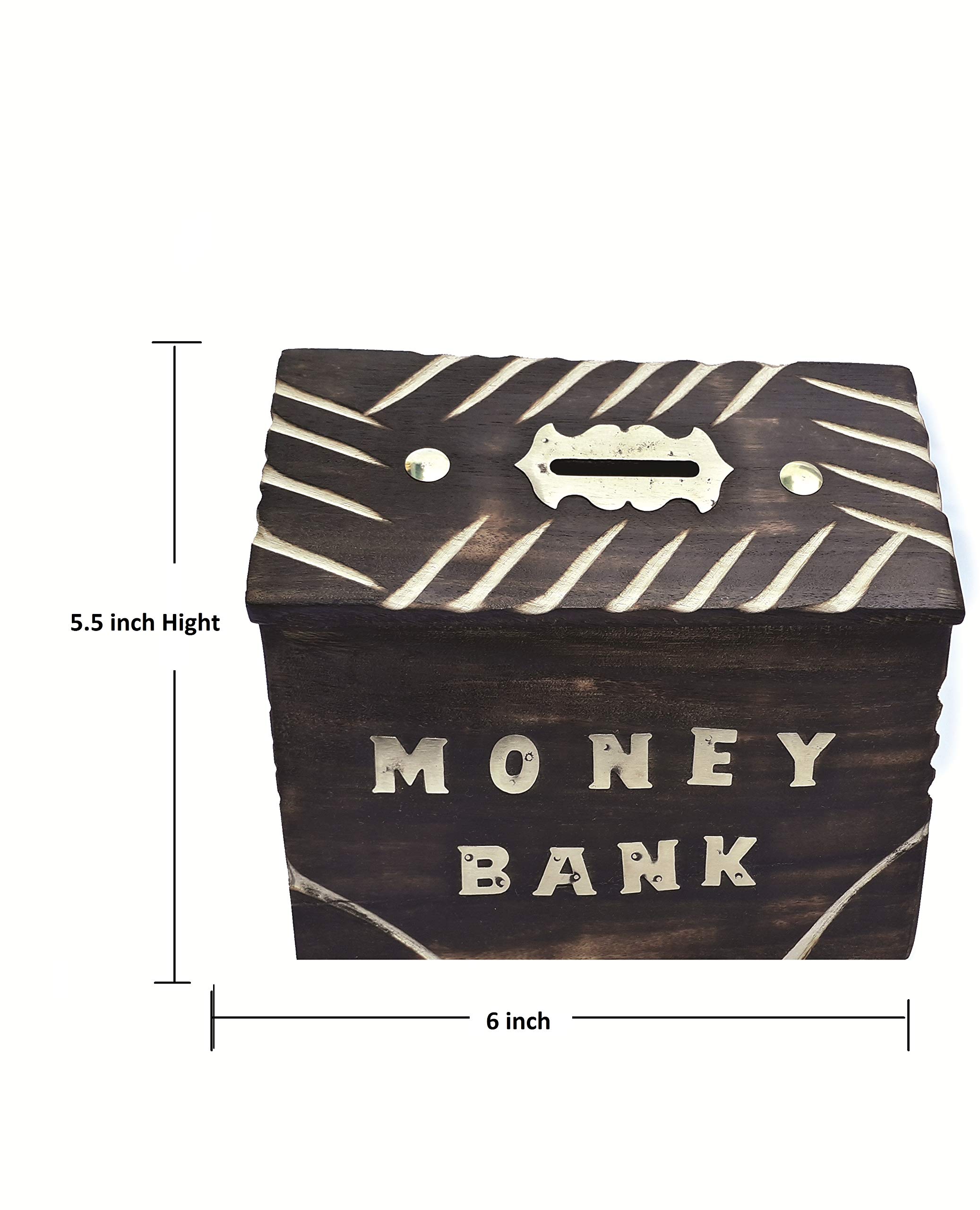 Product Dimensions (L x W x H): 6 inch x 4 inch x 5.5 inch Material: Wood Made by rural artist of India Included Items: 1 Coin Bank with Key Care Instructions: Normal Care Handicrafted Wooden Money Bank Home Style Kids Piggy Coin Box Gifts Made with high durable quality Wood that gives you assurance of stability of item.