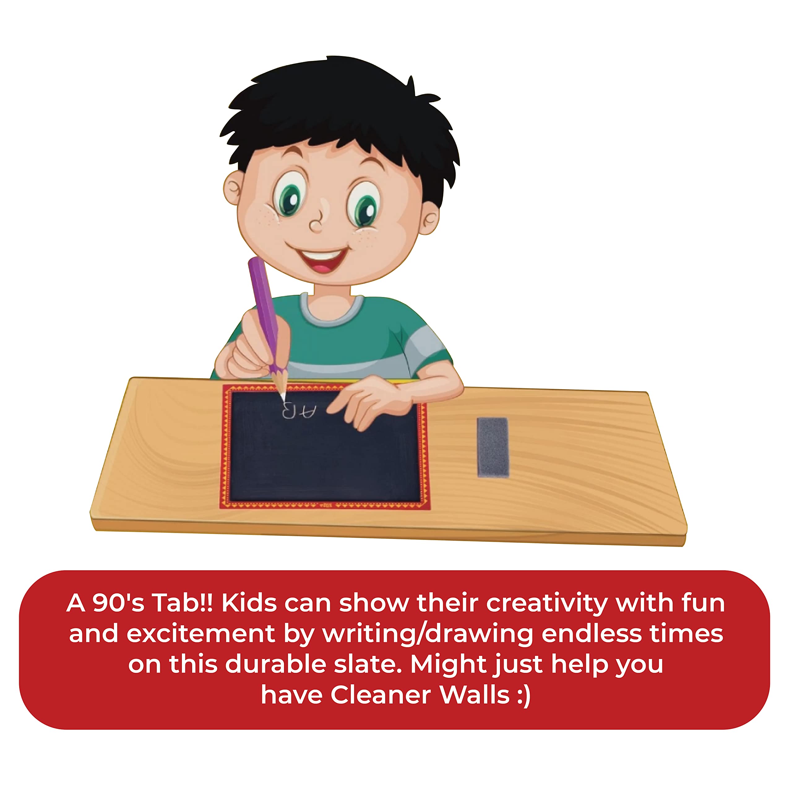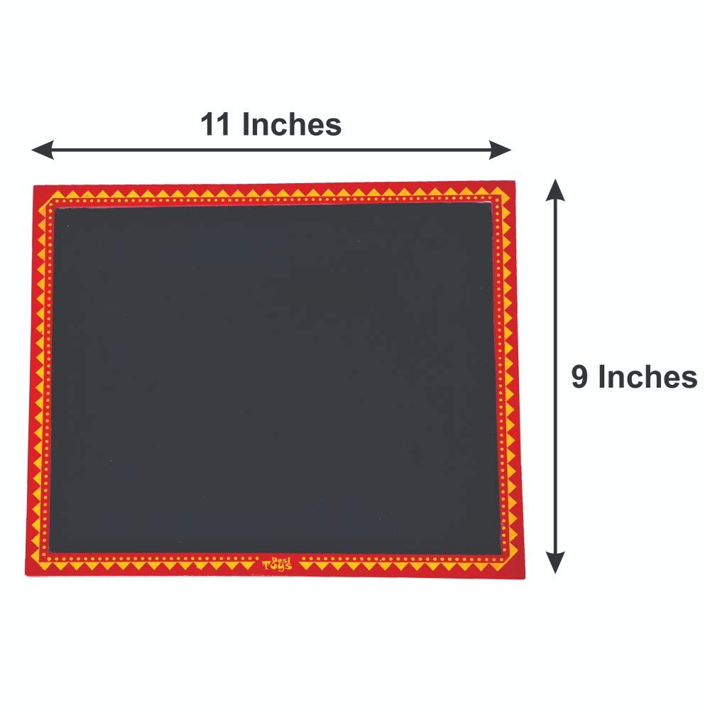 VARANASI WOODEN TOYS Wooden Framed Slate Board | Writing Black Boards | with Slate Pencils & Duster | Handpainted Borders | Red & Yellow Colors | for Kids | Size - 11" x9"x0.5" | for 4 Years and Above
